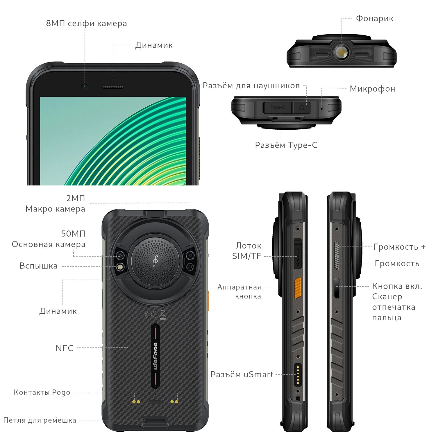 3. Предыдущие характеристики являются теоретическими значениями, основанными на конструкции продукта. Некоторые функции и технические характеристики могут различаться в зависимости от рынка. Для предоставления точной информации о продукте, технических характеристик и функций Ulefone может в режиме реального времени вносить коррективы в предыдущие спецификации, чтобы они соответствовали производительности продукта, спецификациям, индексам и компонентам фактического продукта. Информация о продукте может быть изменена и дополнена без предварительного уведомления.